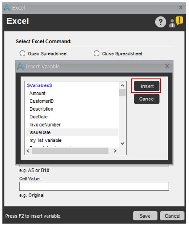 步骤8.2:在打开的对话框中,转到单元格部分,按F2并选择你要选择的变量名称。然后单击“插入”。在这里,我们选择IssueDate。