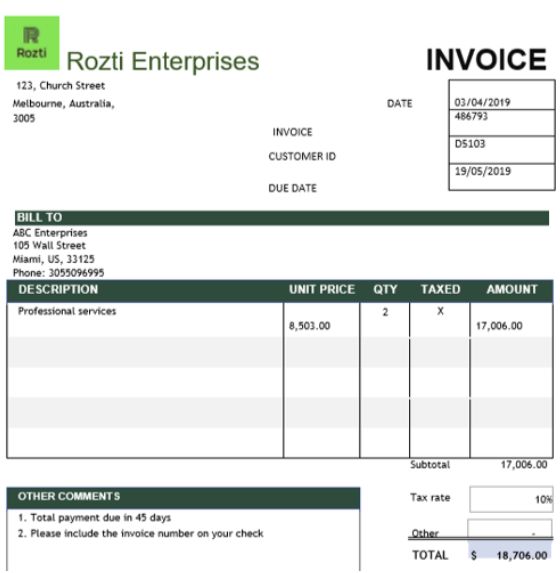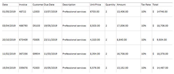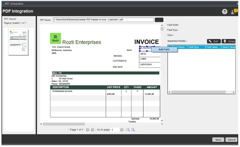 步骤3:现在选择你要提取数据的PDF,并记下要提取数据的所有内容。以下截图中显示了我们想从中提取的数据。在这里选择提取日期、发票、客户ID、到期日、描述、单价、数量、金额、税率、总计。