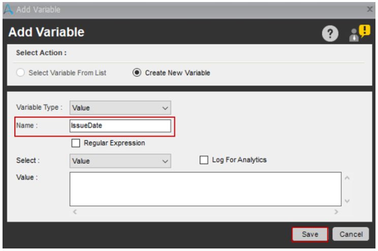 步骤4.1:单击“添加”选项。在打开的对话框中,在“名称”字段中填写变量的名称(提取数据的类型),然后单击“保存”。如下图所示: