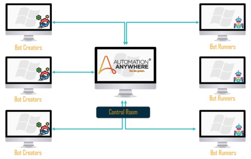 AutomationAnywhere遵循分布式架构。这种架构,可以通过AutomationAnywhere的控制器进行集中管理。该工具的架构主要分为Bot Creators和Bot Runners。这两个组件都连接到控制器,如下图所示: