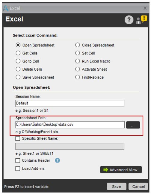 步骤5.1:点击省略号按钮,选择需要提取数据的Excel文件的路径。然后单击“保存”。此步骤将设计打开Excel文件的流程。