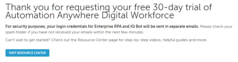 第3步:填写完所有信息后,单击“开始试用”选项,然后你将看到一条消息,显示你已收到Enterprise RPA和IQ Bots的电子邮件。如下图所示:
