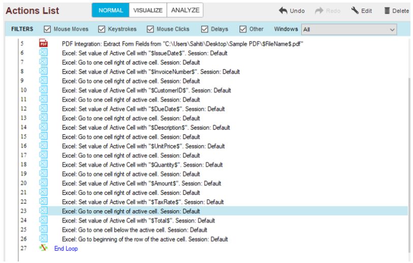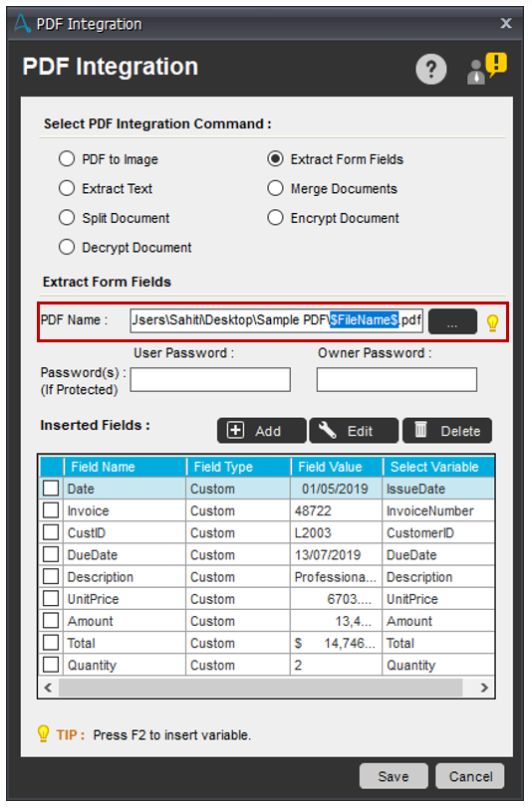 步骤11.4:双击PDF Integration命令并在PDF Name部分中插入所需的变量($ FileName $)。