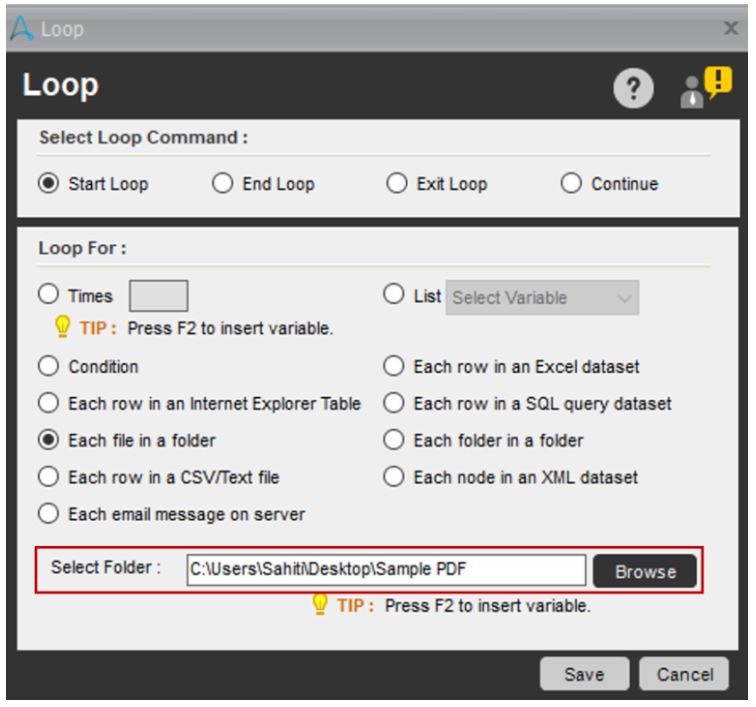 步骤11.2:在此处选择双击文件夹命令中的每个文件,然后从浏览选项中选择包含所有PDF文件的文件夹的路径。然后单击“保存”。