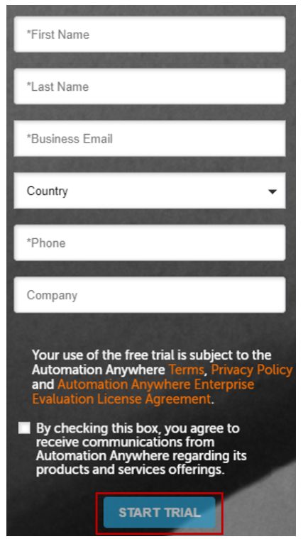 第1步:进入到Anywhere的官方网站(https://www.automationanywhere.com/in/lp/free-trial)打开链接,然后选择“开始试用”选项。