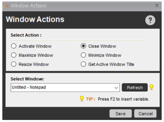 步骤1:打开Automation Anywhere客户端并选择Windows操作功能。从此功能中选择“关闭窗口”命令。将此命令拖到工作台。步骤2:在打开的对话框中,选择要关闭的窗口。单击“保存”。如下图所示: