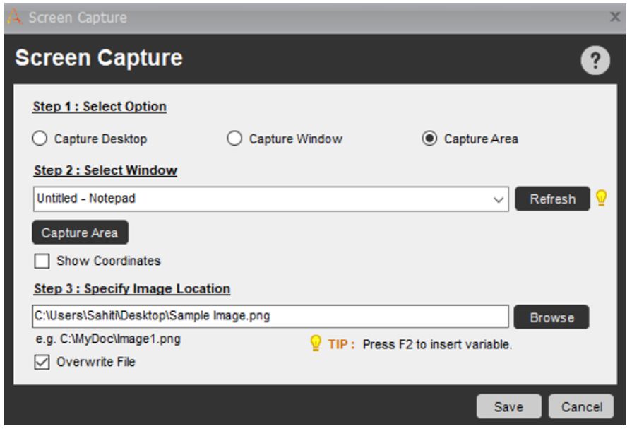 步骤1:打开Automation Anywhere客户端并选择屏幕捕获功能。从此功能中选择“捕获区域”命令,将此命令拖到工作台。