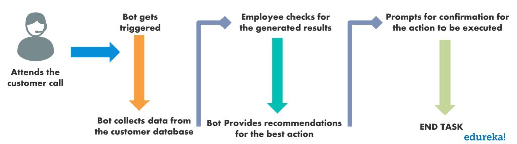 为了减少手动劳动力的负担,可以在Automation Anywhere中设计机器人,设置好一些客户常见的问题,并同时收集信息。在认知能力的帮助下,机器人可以进一步推荐下一步要采取的最佳行动。因此,通过这种方式,机器人可以确保员工提供更好的服务,并且还可以保持与客户进行友好的互动。如下图所示: