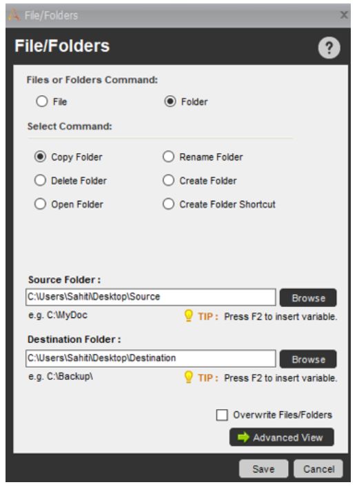 步骤1:打开Automation Anywhere Client并转到“文件/文件夹”功能。选择“复制文件”操作并将其拖动到工作区。