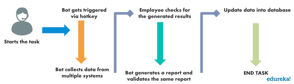 员工可以通过热键设置触发机器人从多个系统收集数据。然后,员工可以检查生成的结果验证生成报告。验证报告后,将数据更新到数据库中,这将结束你的任务。流程如下图所示: