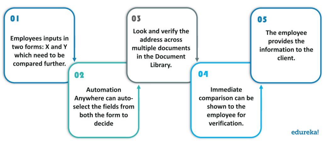 在AutomationAnywhere的帮助下,可以构建一个自动化通信的解决方案。员工可以从文档库中获取所有必需的信息,然后借助AutomationAnywhere中的热键启动验证过程。此外,你还可以设计工作流程在员工屏幕上打开表单,识别相关文档,从文档库中为员工收集这些文档,然后员工可以使用此文档向客户提供信息。如下图所示:
