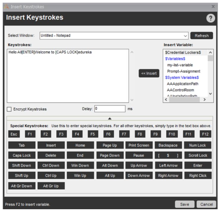 步骤1:打开Automation Anywhere Client并选择insertkeystrokes命令。