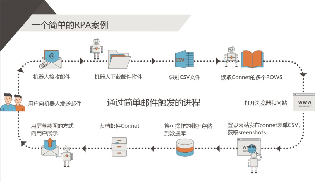 下面是一个关于RPA操作的简单示例,其中传入的邮件事件触发机器人跨应用程序执行任务,并通过屏幕截图的方式完成证据还原。