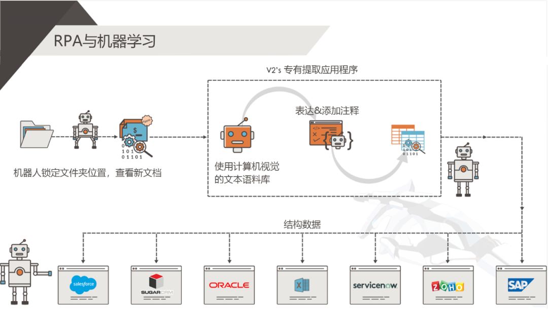 关于RPA在认知抓取方面,它结合V2专有的软件文档抓取,利用计算机视觉和机器需学习扫描的文档中提取非结构化数据,并将其传输到目标应用程序,如CRM、DataBases、ITSM、ERP等。