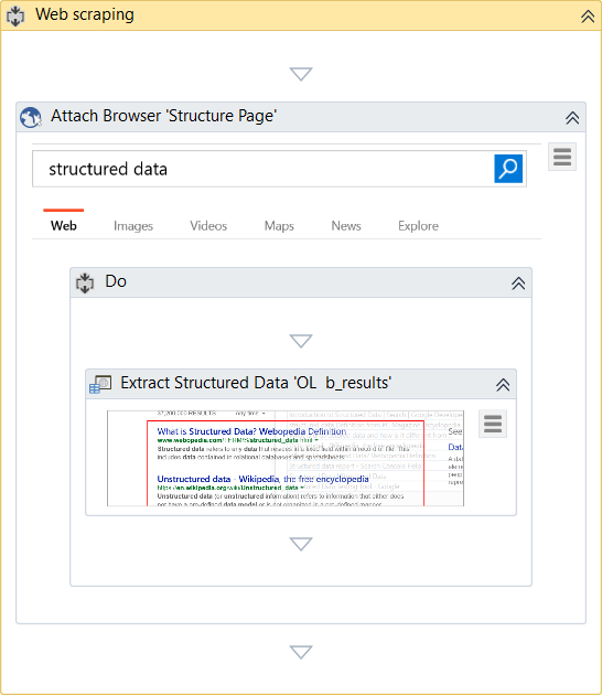 数据抓取始终会生成一个容器(“附加浏览器”或“附加窗口”),该容器带有用于顶层窗口的选择器,以及带有部分选择器的“ 提取结构化数据”活动,从而确保正确识别要抓取的应用程序。