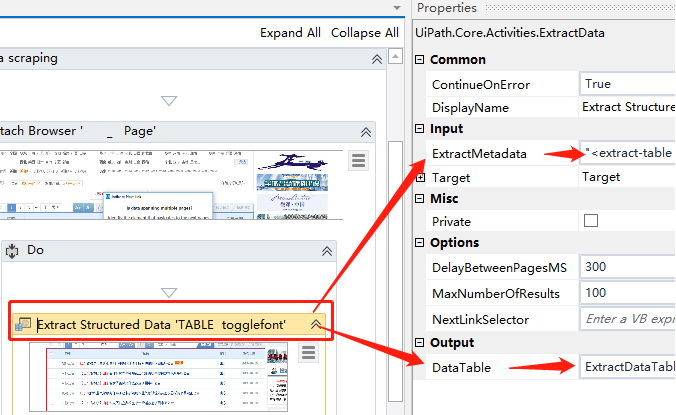 此外,“提取结构化数据”活动还带有一个自动生成的XML字符串(在ExtractMetadata属性中,其中自动抓取生成的内容很简单,手动一列一列抓取的内容稍微复杂点,好在都是自动生成,无需太多关注),该字符串指示要提取的数据。