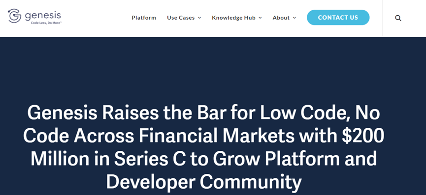 让人惊讶的是,虽然Genesis创立于2012年,但在2021年之前仅获得了500万美元融资。2021年3月,Genesis迎来了发展转折点,获得了由Accel领投,花旗银行跟投的4500万美元B轮融资。也就是说Genesis在不到1年的时间,已获得2.45亿美元融资,从而晋身金融低代码领域的独角兽。