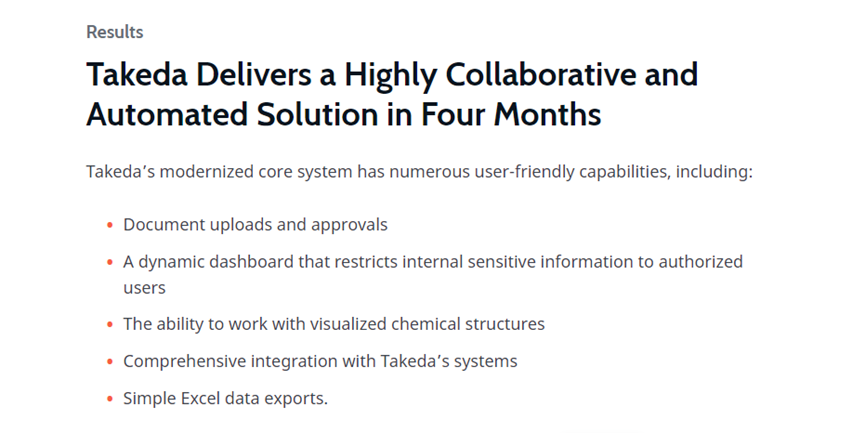 为了提升医药研发效率,加快数字化建设进程,武田制药在Do iT Lean的建议下通过OutSystems低代码平台,仅用4个月时间开发了化合物合成、化合物结构检测、日常办公等多个应用,从而节省大量开发时间。