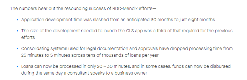2013年6月,BDC的全新核心借贷系统矩阵已上线运营,仅用8个月的时间便完成了之前需要30个月才能实现的开发目标。“低代码的开发效率超出我们的预期,同时与现有业务进行了准确匹配,消除了众多集成障碍。”BDC的开发人员Dan Covaliu表示。