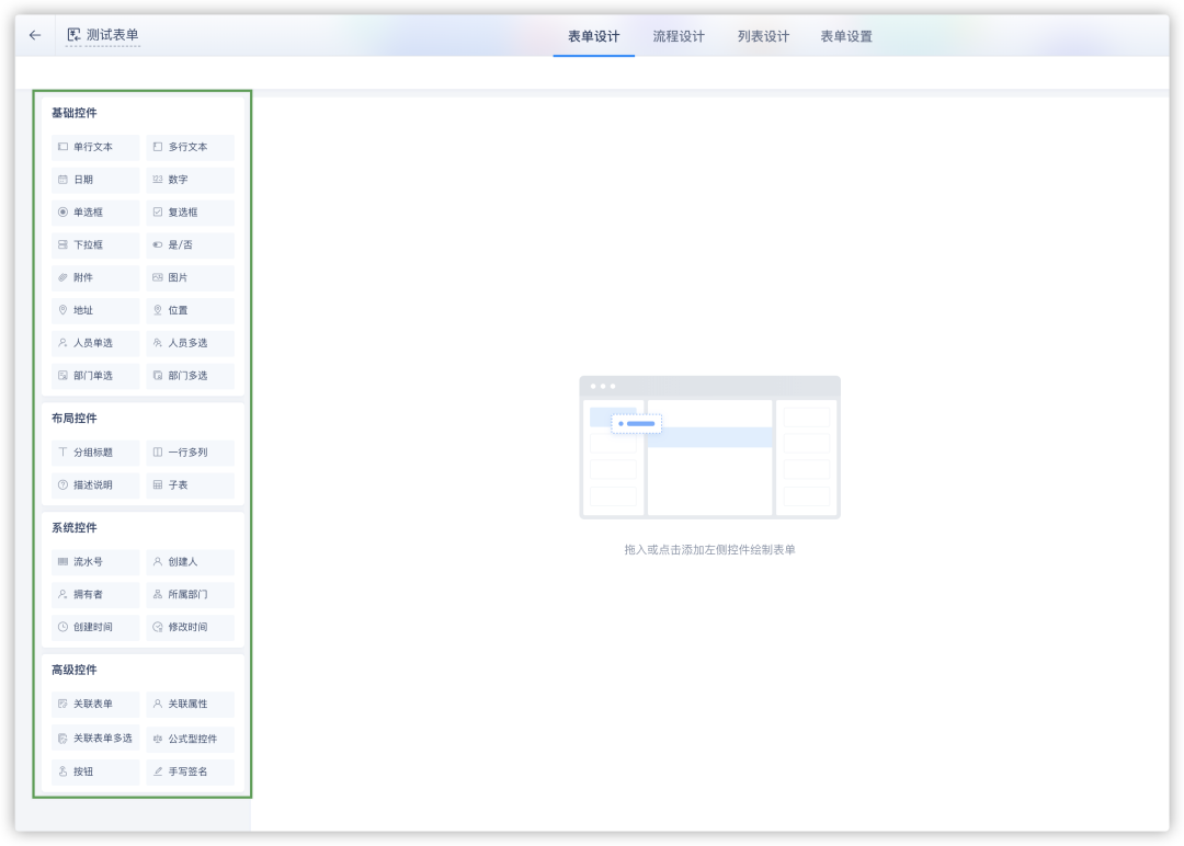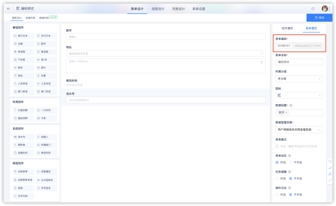 1、表单设计提供了四类控件(基础控件、布局控件、系统控件、高级控件)满足表单需求。高级控件可实现表单关联等复杂一些的功能。表单属性中还可将应用在电脑端和手机端的展示进行不同的设置,对其样式进行适配。