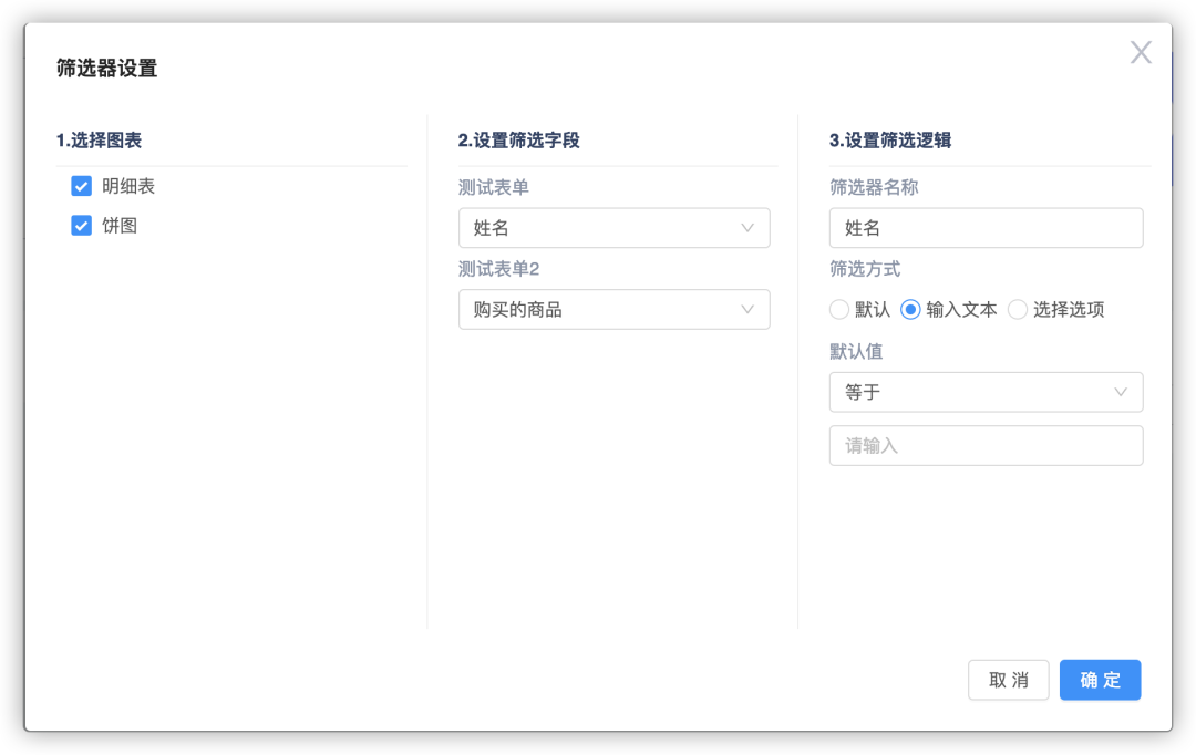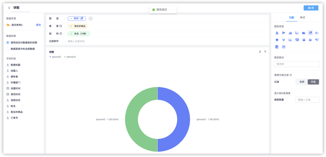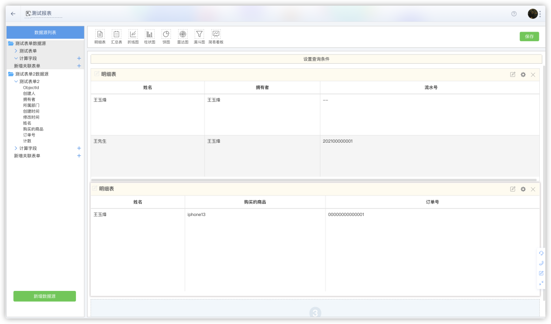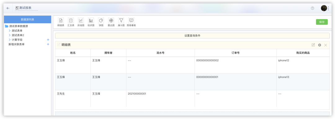 报表还可以进行表单关联,将多张表单中的数据放到同一个图表中。示例图中展示的是:测试表单和测试表单2的数据进行关联,展示当某一个用户购买的所有商品。