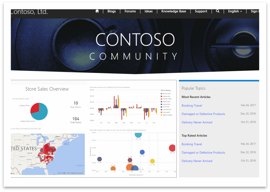 实时的数据展示和分析。通过集成 Power BI ,将报表、实时仪表板和磁贴等组件直接嵌入网站。