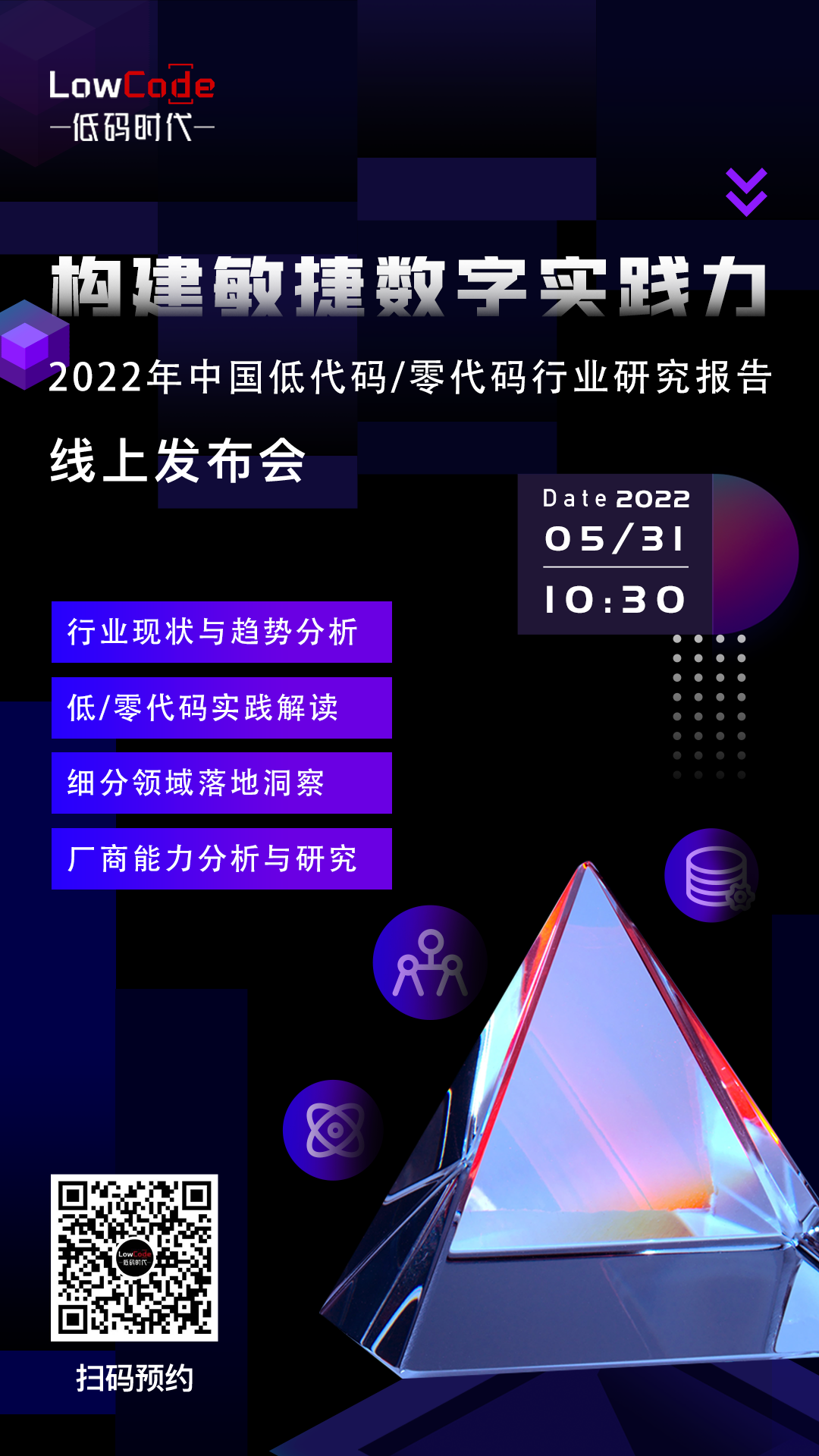 完整报告欢迎大家在2022年5月31日10:30,参加《构建敏捷数字实践力-2022年中国低代码/零代码行业研究报告》线上发布会获取。