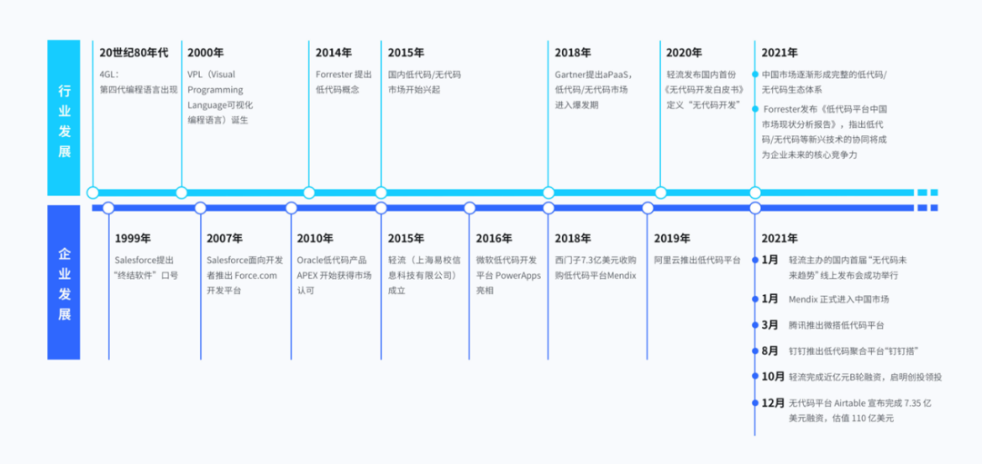不过低代码/无代码并不是一个新词,实际上,2014年研究机构Forrester就正式提出了“低代码”的概念,这类平台面向的是IT专家或者平民程序员,以快速交付应用程序为目的,解决传统软件开发模式带来的周期长、成本高等问题;Gartner随后用基于aPaaS的高生产力平台(hpaPaaS)来命名这一类产品, Microsoft、Mendix等深耕低代码头部企业也逐步入局。