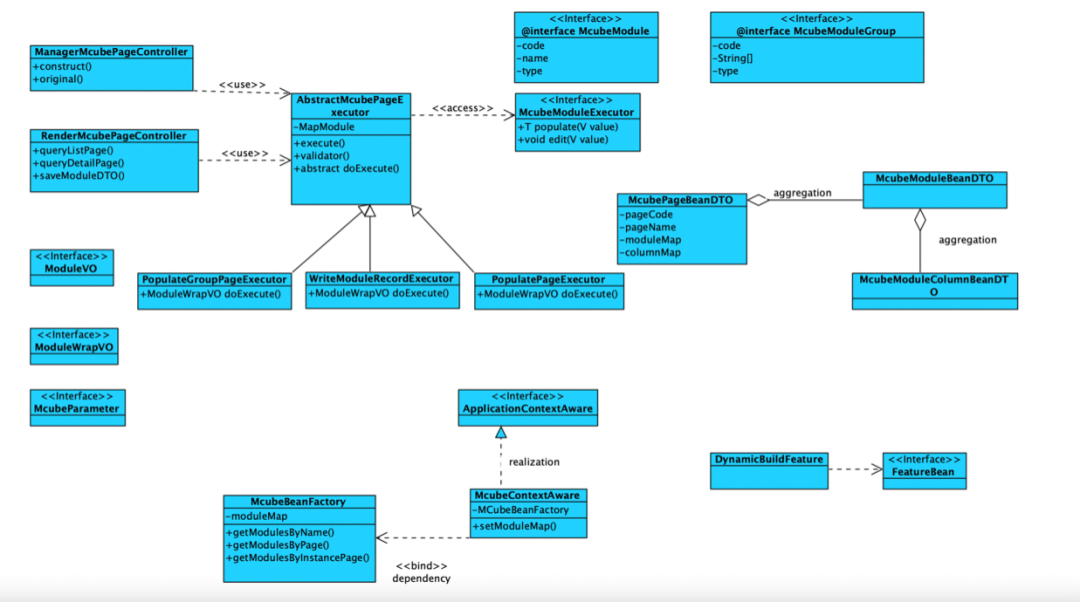 @Component public class McubeContextAware implements ApplicationContextAware { private static volatile ApplicationContext alc; @Resource private ModuleBeanFactory moduleBeanFactory; @Resource private ModuleGroupBeanFactory moduleGroupBeanFactory; @Override public void setApplicationContext(ApplicationContext applicationContext) throws BeansException { alc = applicationContext; } @PostConstruct public void init(){ setModuleBeanMap(); setModuleGroupBeanMap(); } private void setModuleBeanMap() { Map<String, McubeModuleExecutor> beanMap = alc.getBeansOfType(McubeModuleExecutor.class); if (beanMap != null) { beanMap.values().stream().forEach(m -> { McubeModule module = AnnotationUtils.findAnnotation(m.getClass(), McubeModule.class); if (module != null) { String code = module.code(); String name = module.name(); if (code != null) { moduleBeanFactory.getMcubeBeanMap().put(code, m); } } }); } } private void setModuleGroupBeanMap() { Map<String, McubeModuleExecutor> beanMap = alc.getBeansOfType(McubeModuleExecutor.class); if (beanMap != null) { beanMap.values().stream().forEach(m -> { McubeModuleGroup module = AnnotationUtils.findAnnotation(m.getClass(), McubeModuleGroup.class); if (module != null) { String code = module.code(); String name = module.name(); moduleGroupBeanFactory.getMcubeBeanMap().put(code,m); } }); } } } 执行单元(moduleGroup executor)