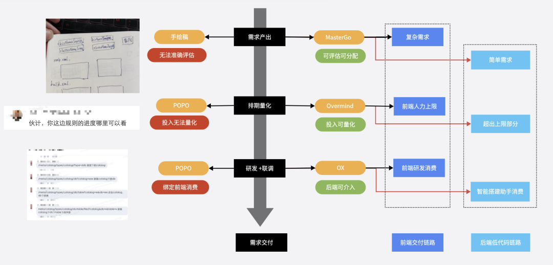 为了保证上述方案能够落地,前端主导发起双周评审PK,需求先在后端内部PK,再根据 “分级保障标准”,一部被分流给后端搭建,一部分被挤出,我们会为其提供必要的使用培训、落地辅导,为低代码落地创造 “机制保障”