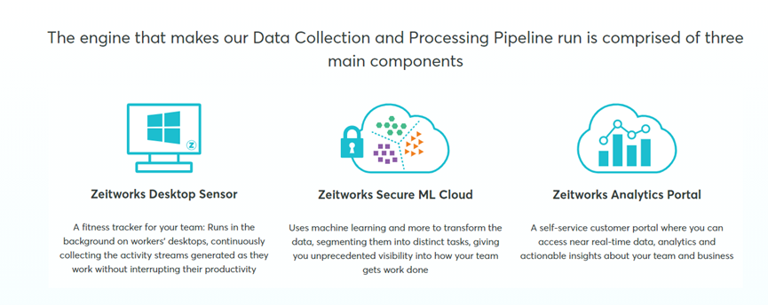根据Zeitworks的官网技术介绍,其桌面流程挖掘是在传统任务挖掘之上,新增了实时数据分析、自动映射、机器学习等创新技术。Zeitworks的桌面流程挖掘主要由桌面传感器、机器学习云、数据分析三大块组成。
