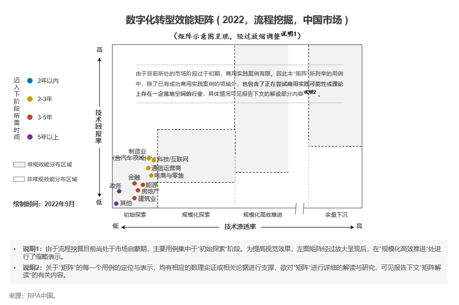 在《2022年中国流程挖掘行业研究报告》中,RPA中国分析团队基于“数字化转型效能矩阵( 2022,流程挖掘,中国市场 )”的研究成果,对科技与互联网、制造业、金融领域中的潜在行业用户的流程挖掘实践意愿( 技术采纳接受度 )、用户的要点反馈、商用实践趋势展开了分析与预测,对典型的实践案例进行了解读。