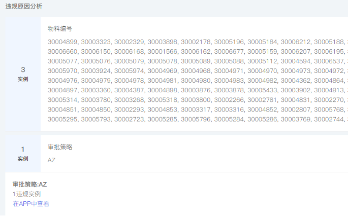 在合规分析的基础之上,ProcessX还提供了对不合规行为的根因分析功能。即:针对不合规行为,以数据为基础,快速发现和定位到不合规行为发生的根源。如下图所示,通过点击ProcessX上的根因分析按钮,我们可以快速定位到不合规产生的原因可能是物料或者审批策略等问题。