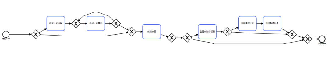 ProcessX提供了合规分析模块,可以快捷地对历史业务进行业务流程的合规性分析。特别地,在控制流分析方面,ProcessX以流程基准模型(例如下图所示的BPMN模型)和事件数据作为输入,利用一致性检测算法将模型允许的行为和日志中观察到的行为进行比较,从而确定实际执行是否符合一些预定义的行为控制流。