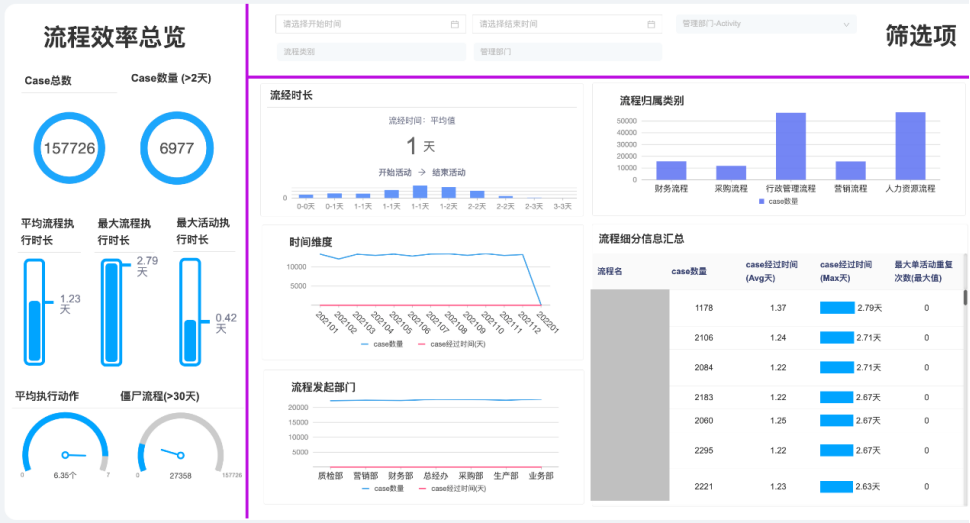 与历史业务数据分析相似,ProcessX同样也提供了对控制流和业务规范的实时监控能力。基于对上面提到的XQL(流程业务查询语句)、复杂业务流程规范逻辑、风险检测函数等控制流或者业务规范的设置,ProcessX能够完成对流式数据的合规分析。如下图所示,根据设置的规则,结合数据分析组件,用户可以对企业运营中的各个流程(财务流程、采购流程、行政管理流程等)的运行情况(实例数、效率、类别等)进行监控,并对一些不合规的行为进行快速识别。例如,通过针对流程实例中的僵尸流程实例的识别,企业可以推动更迅速的流程实例处理,减少部门积压的僵尸流程实例数量。