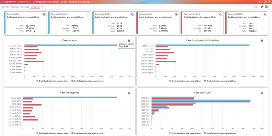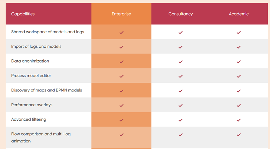 Apromore的流程挖掘产品功能包括:流程模型和日志共享,发现流程图和BPMN模型,性能叠加,视觉过滤,智能分析仪表盘,流量对比和日志动画,合规检查,一致性检查,任务挖掘,BPMN模型搭建,模型增量分析,端到端模拟,流程挖掘模拟,数据连接和ETL管道,预测性业务流程模拟等20多项功能组成。
