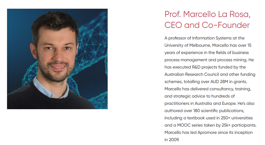 资料显示,Apromore创立于2009年,总部位于澳大利亚墨尔本,并在爱沙尼亚、英国、新西兰设有办事处。Apromore曾获得了770万美元种子轮融资和530万美元A轮融资。Apromore拥有很强的技术研发团队,其两位联合创始人Marcello La Rosa和Marlon Dumas,分别是墨尔本大学科技学院和塔尔图大学信息学院的教授。
