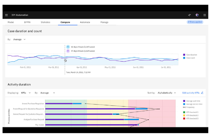 3)根本原因分析:该功能可发现流程中的问题所在,以及违规行为发生的原因。用户通过应用 IBM 流程挖掘或集成用户自己的AI、机器学习算法,可深度查明更多业务偏差的根本原因。