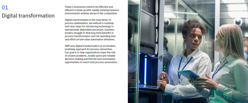 IBM 将数字化转型视为一种迭代、多步骤的流程重塑方法。IBM的目标是帮助组织降低未知的业务流程风险,实现快速可靠的智能决策,并找到业务流程自动化的最佳机会。