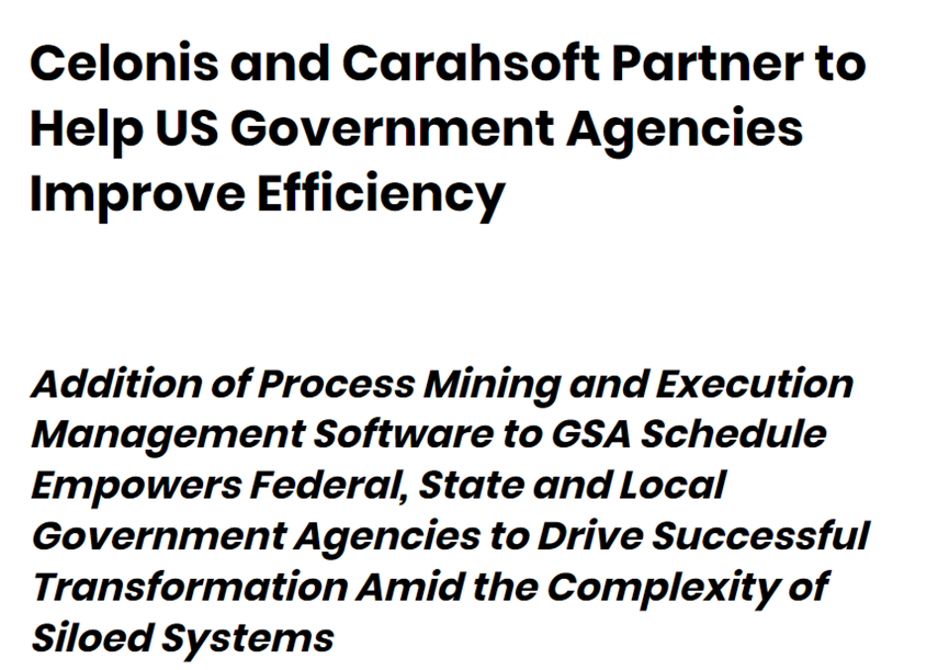 近日,全球流程挖掘领导者Celonis和著名政务IT解决方案提供商Carahsoft,在官网同时宣布,将一起合作为美国联邦、州和地方政府提供流程挖掘智能技术,以加速数字化转型。