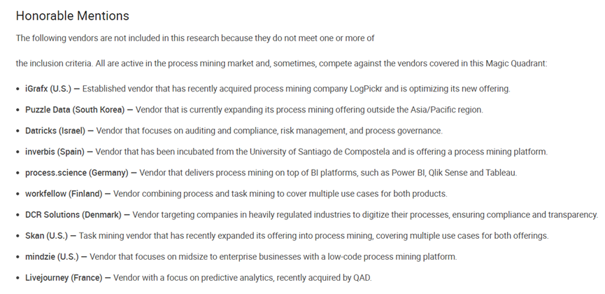 此外,美国的iGrafx、韩国的Puzzle Data、以色列的Datricks、西班牙的inverbis、德国的process.science、芬兰的workfellow、丹麦的DCR Solutions、法国的Livejourney、美国的mindzie、美国的Skan没有入选本次魔力象限,但获得了Gartner颁发的荣誉奖。