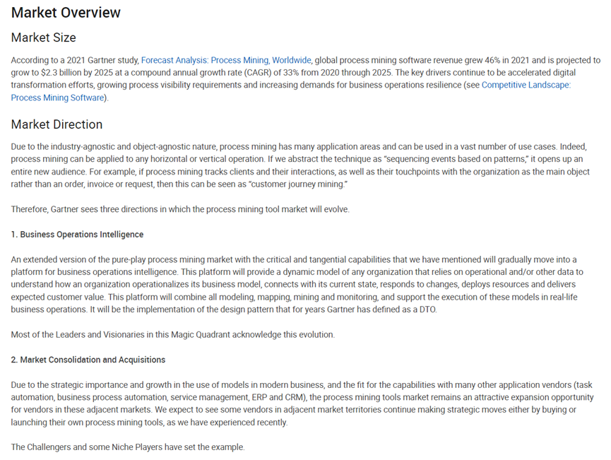 2)市场整合与收购:由于流程挖掘在现代商业中的重要性和使用的增长,以及与许多其他应用程序供应商(任务自动化、业务流程自动化、服务管理、ERP 和 CRM)的能力相融合,流程挖掘市场仍然是一个对相邻技术市场供应商,具有很大的吸引力。