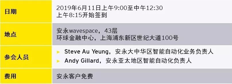安永在此诚挚邀您参加“安永中国2019智能自动化峰会”。本次活动面向业内高级主管,仅限邀请参加。届时,安永亚太地区智能自动化的领导团队以及在IA(智能自动化)数字化转型方面拥有丰富而宝贵经验的行业高管将分享他们的洞察与见解。