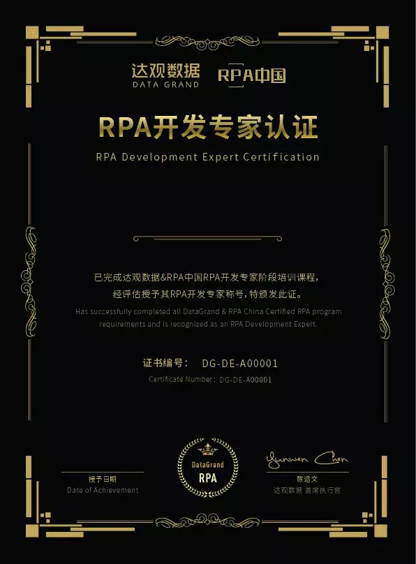 课程结束通过测试即可获得达观数据与RPA中国共同颁发的RPA官方资质证书。