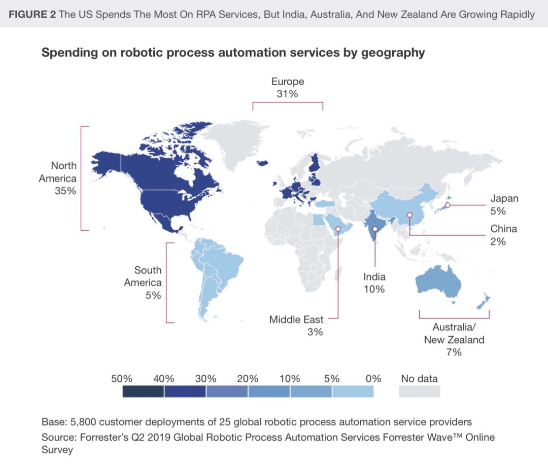 根据Forrester的预测,到2023年全球RPA市场将达到120亿美金。而目前中国市场在全球占比仅有2%