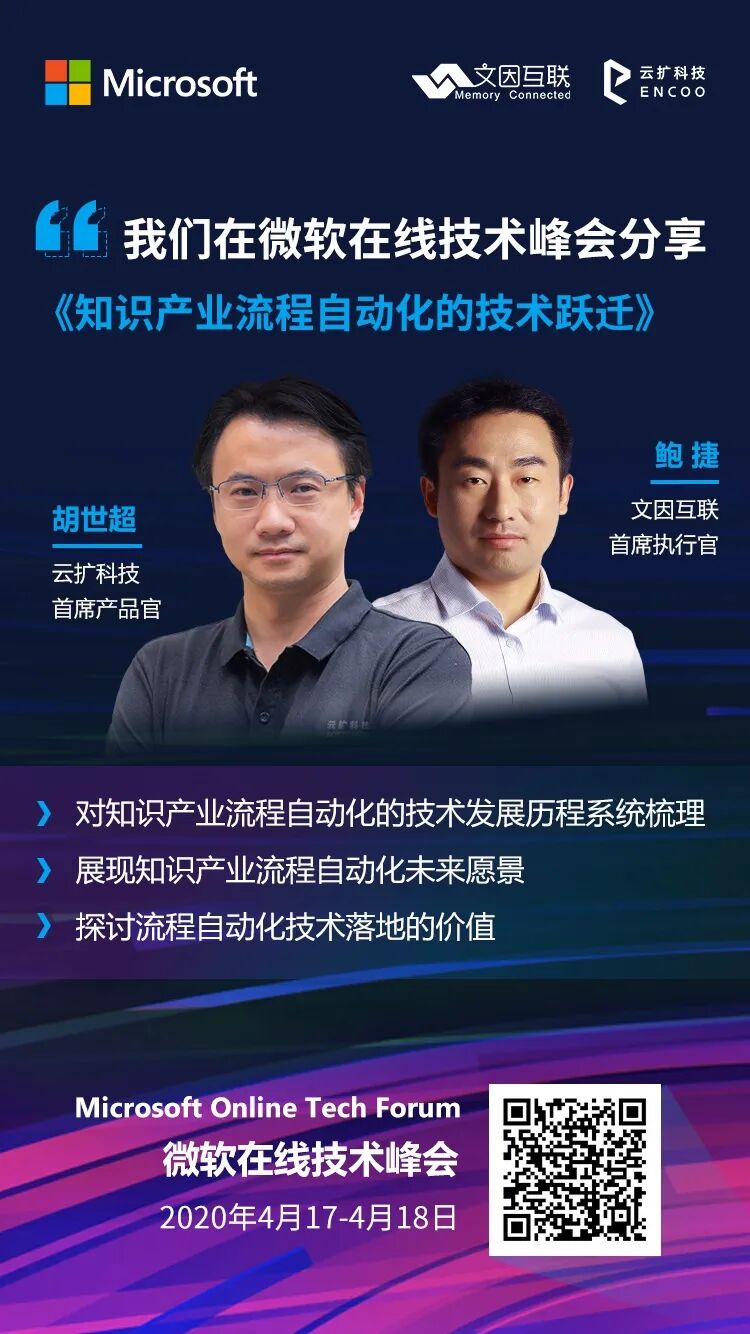 此次,在微软在线技术峰会胡世超将带来《知识产业流程自动化的技术跃进》,与在线观众针对以下问题展开深度探讨。