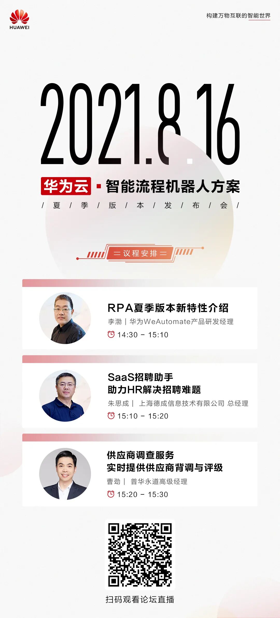 获取更多关于华为WeAutomate RPA夏季版本惊喜?8月16日 14:30,智能流程机器人方案-华为RPA夏季版本发布会直播,不要错过!