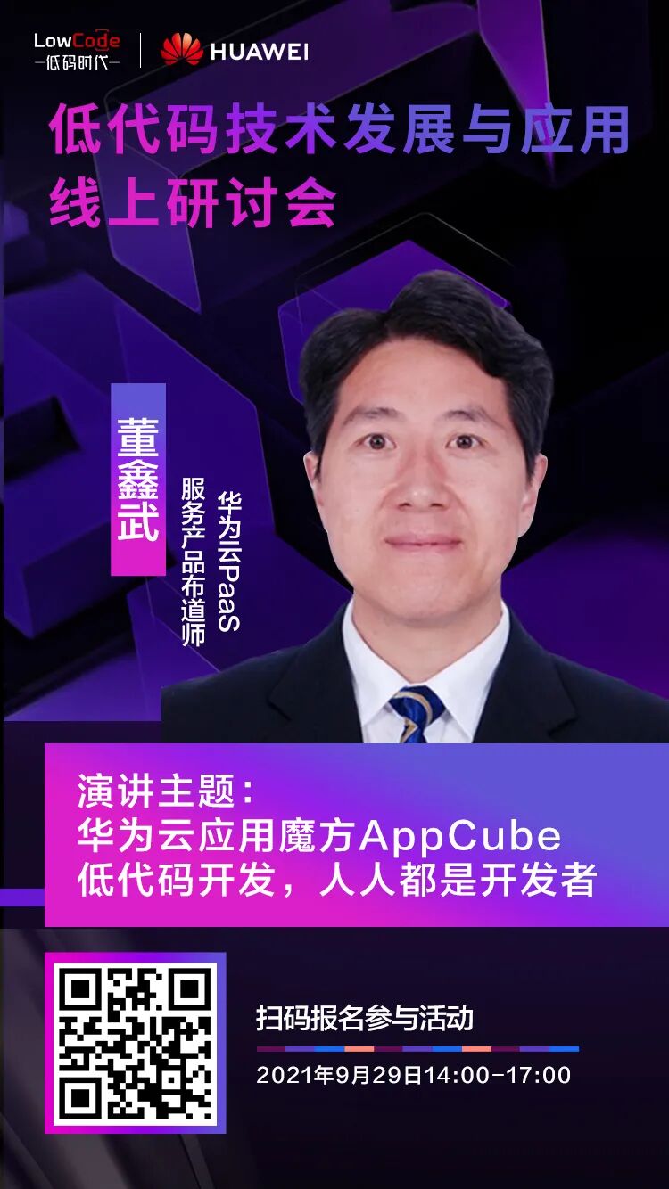 本次大会将围绕低代码应用最佳客户成功案例,云原生、容器化、边缘计算与低代码技术的结合,低代码开发模式与传统开发模式对比等创新性主题进行精彩分享,华为云PaaS服务产品布道师董鑫武,作为特邀嘉宾将出席此次大会并做AppCube低代码平台的重要演讲。