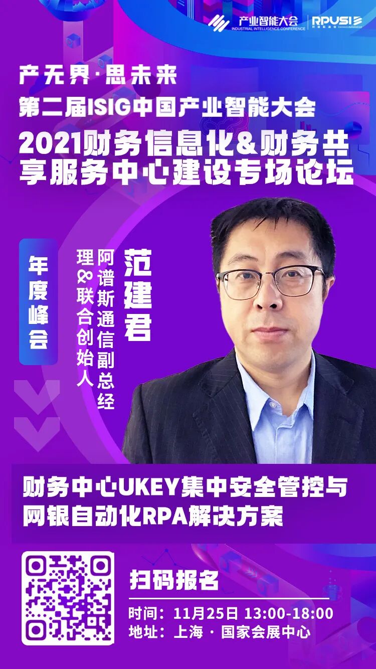 阿谱斯(上海)通信技术有限公司副总经理及联合创始人范建君,作为特邀嘉宾将出席此次大会,并将在“ISIG-财务信息化&财务共享服务中心建设专场论坛”与现场嘉宾分享《财务中心Ukey集中安全管控与网银自动化RPA解决方案》。