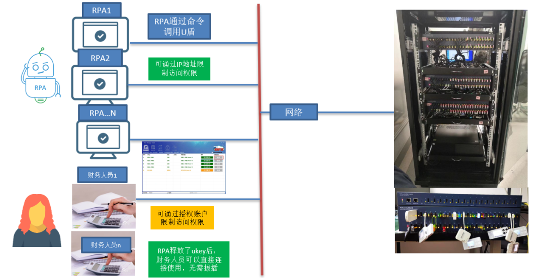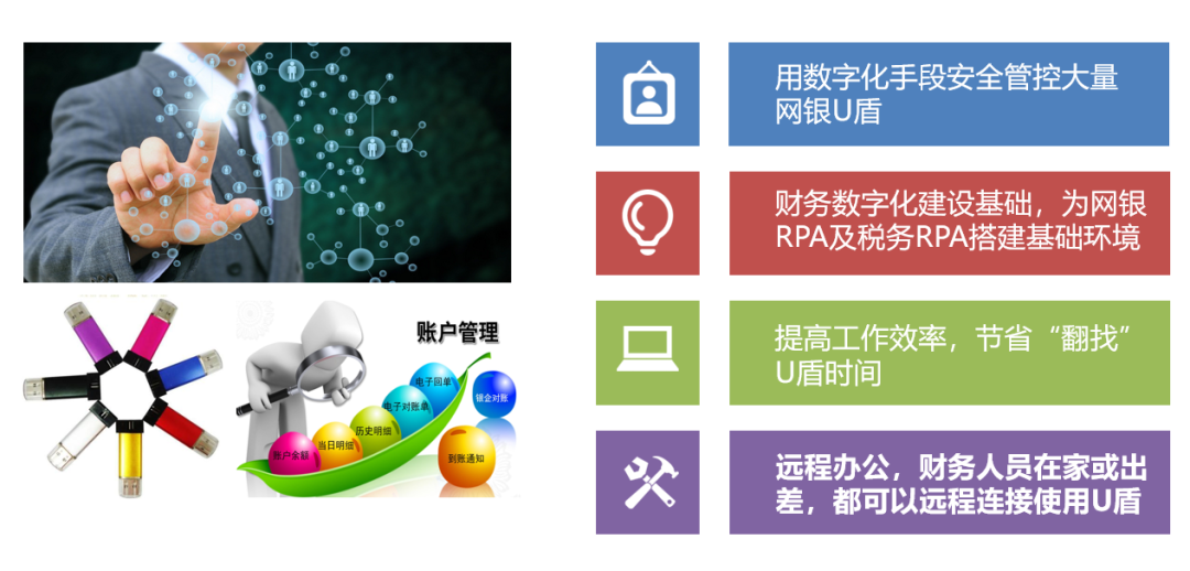 通过阿谱斯ukey manger安全管控软件,对所有U盾统一集中到管控平台,按账户授权分配不同U盾给不同财务人员,实现严格按权限管控U盾,并且支持多级密码保护,操作日志审计、U盾盘点、报警等管理功能;无须插拔U盾,直接点击按钮即可实现插入拔出U盾,配合自动按键器,财务老师点击鼠标即可实现过去插拔按OK键等所有操作。RPA机器人晚上执行,白天释放给财务老师继续使用U盾制单、查询、转账等任务,完美解决了RPA和人的协同工作。